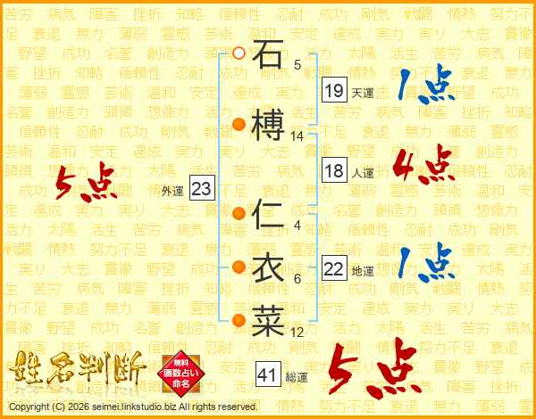 石(5画)榑(14画) 仁(4画)衣(6画)菜(12画)