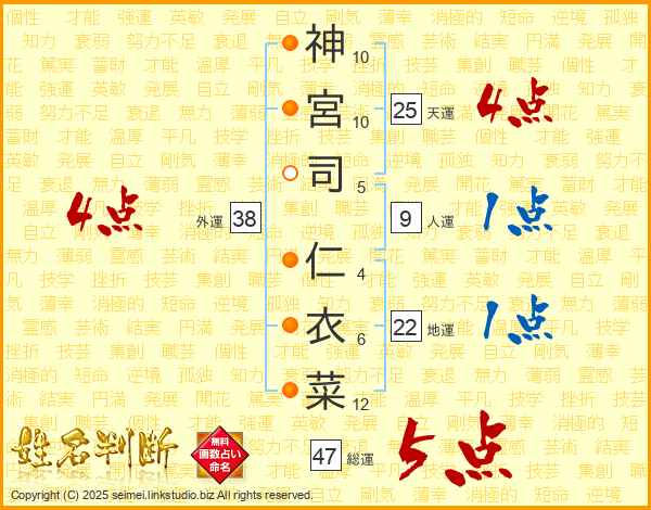 神(10画)宮(10画)司(5画) 仁(4画)衣(6画)菜(12画)
