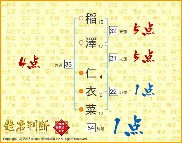 稲(15画)澤(17画) 仁(4画)衣(6画)菜(12画)
