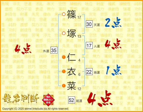 篠(17画)塚(13画) 仁(4画)衣(6画)菜(12画)