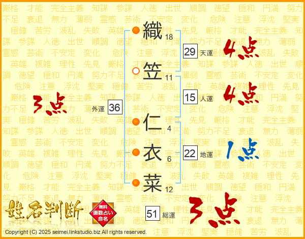 織笠仁衣菜さんの総運は51画の3点!