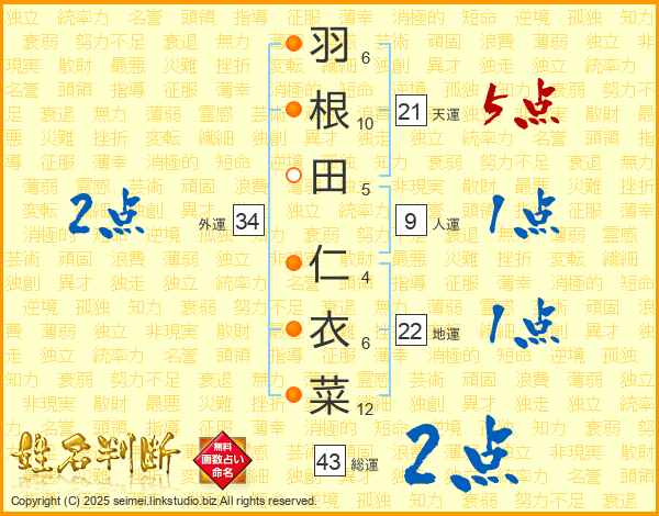 羽根田仁衣菜さんの天運は21画の5点!