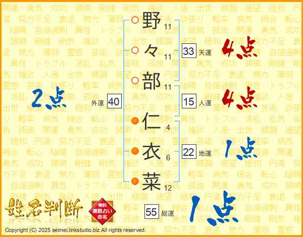 野(11画)々(11画)部(11画) 仁(4画)衣(6画)菜(12画)