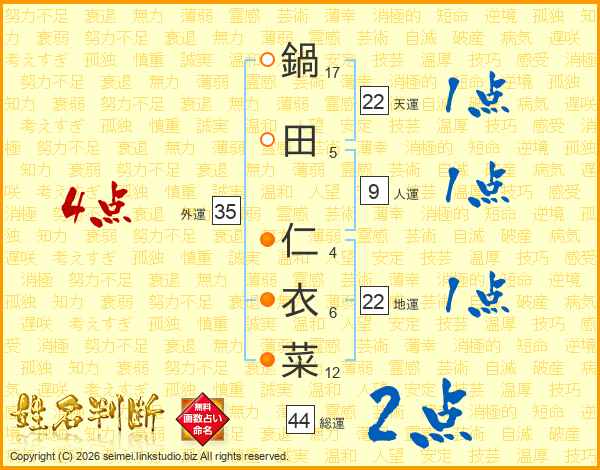 鍋田仁衣菜さんの総運は44画の2点!