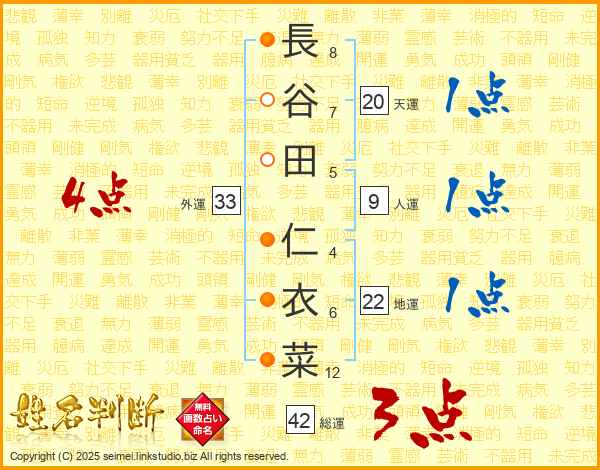 長(8画)谷(7画)田(5画) 仁(4画)衣(6画)菜(12画)