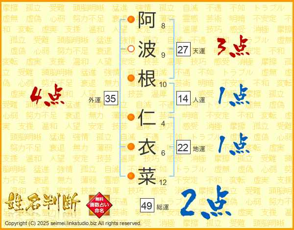 阿波根仁衣菜さんの総運は49画の2点!
