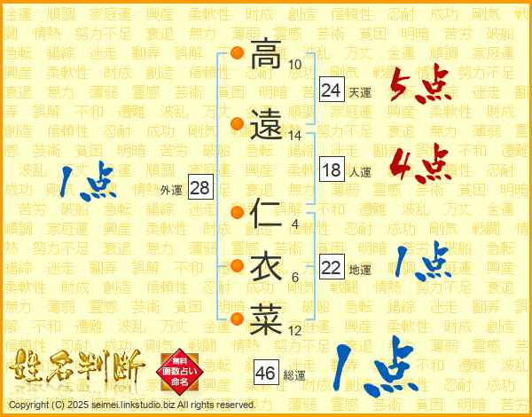 高(10画)遠(14画) 仁(4画)衣(6画)菜(12画)