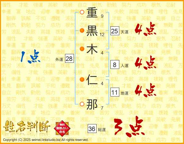 重(9画)黒(12画)木(4画) 仁(4画)那(7画)