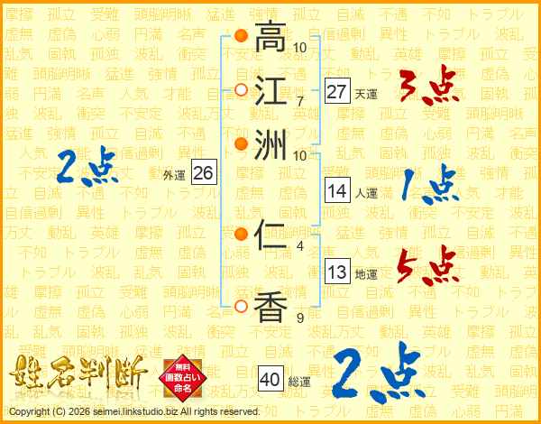 高(10画)江(7画)洲(10画) 仁(4画)香(9画)