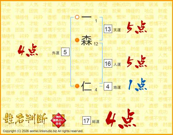生活面を象徴する運勢です。外部から受ける影響力を表し、結婚運、家庭運や職場、環境への順応性を表します。総運から人運を引いた画数。姓や名が1文字の場合を除く。