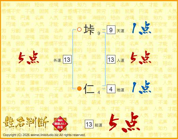垰仁さんの人運は13画の5点!
