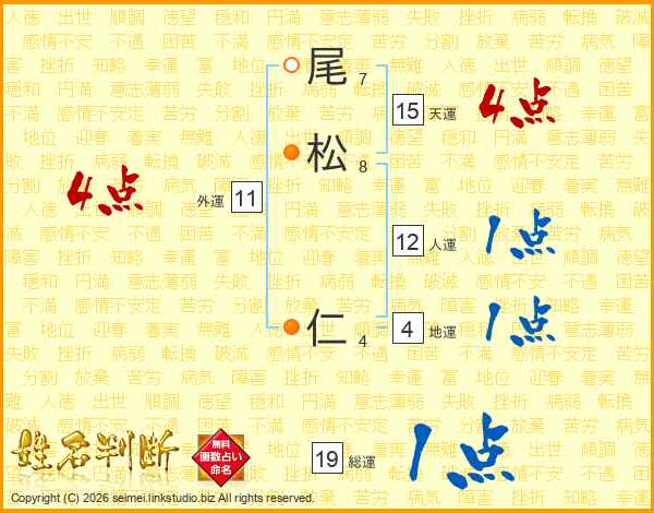 生活面を象徴する運勢です。外部から受ける影響力を表し、結婚運、家庭運や職場、環境への順応性を表します。総運から人運を引いた画数。姓や名が1文字の場合を除く。