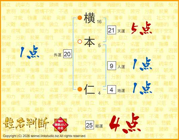 生活面を象徴する運勢です。外部から受ける影響力を表し、結婚運、家庭運や職場、環境への順応性を表します。総運から人運を引いた画数。姓や名が1文字の場合を除く。