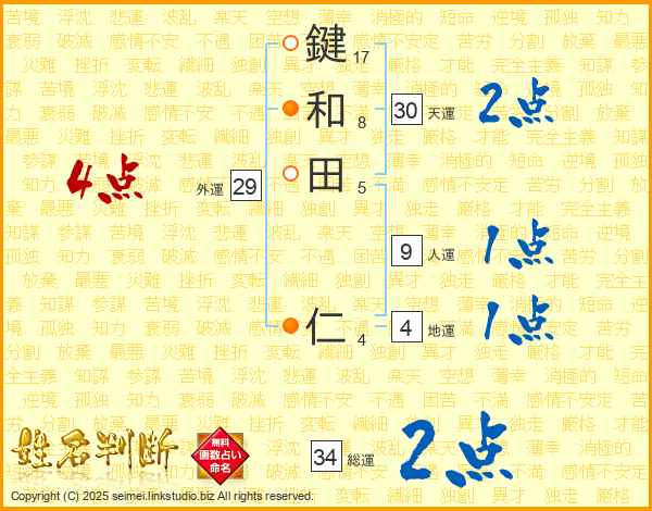 鍵(17画)和(8画)田(5画) 仁(4画)