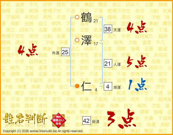 鶴澤仁さんの天運は38画の4点!