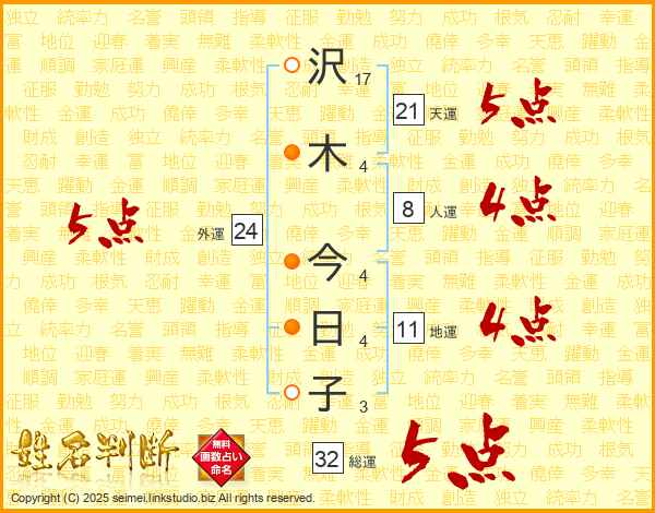 沢(17画)木(4画) 今(4画)日(4画)子(3画)