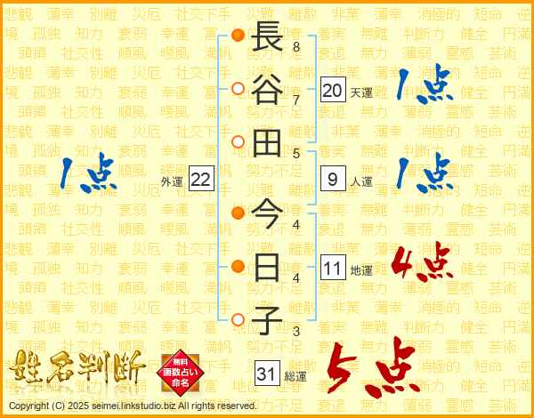 長(8画)谷(7画)田(5画) 今(4画)日(4画)子(3画)