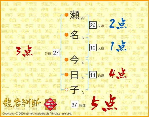 瀬(20画)名(6画) 今(4画)日(4画)子(3画)