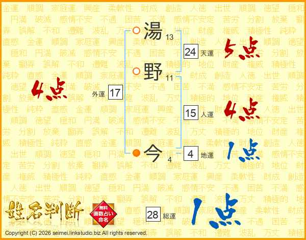 湯野今さんの総運は28画の1点!