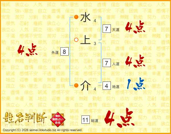 生活面を象徴する運勢です。外部から受ける影響力を表し、結婚運、家庭運や職場、環境への順応性を表します。総運から人運を引いた画数。姓や名が1文字の場合を除く。