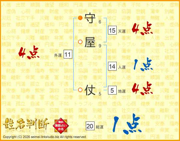 生活面を象徴する運勢です。外部から受ける影響力を表し、結婚運、家庭運や職場、環境への順応性を表します。総運から人運を引いた画数。姓や名が1文字の場合を除く。