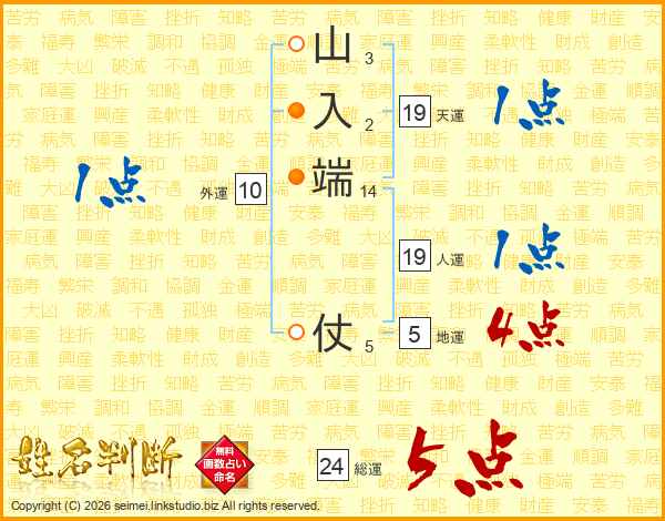 生活面を象徴する運勢です。外部から受ける影響力を表し、結婚運、家庭運や職場、環境への順応性を表します。総運から人運を引いた画数。姓や名が1文字の場合を除く。