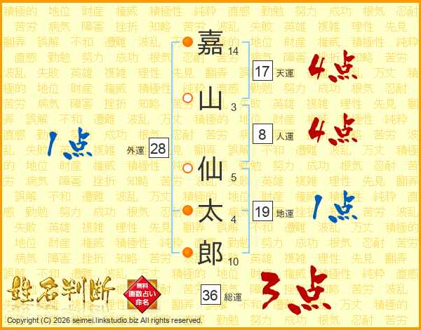 嘉(14画)山(3画) 仙(5画)太(4画)郎(10画)