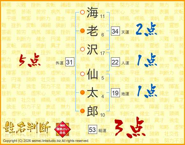海(11画)老(6画)沢(17画) 仙(5画)太(4画)郎(10画)