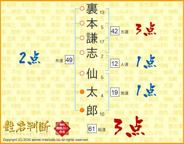 裏(13画)本(5画)謙(17画)志(7画) 仙(5画)太(4画)郎(10画)