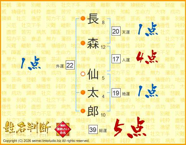 長(8画)森(12画) 仙(5画)太(4画)郎(10画)