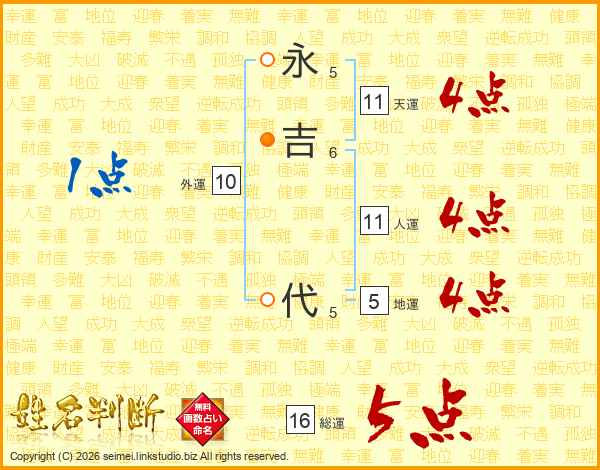 あなたの人生を表す1番重要な運勢です。生涯を通じて影響する総合運となり、主に50歳以降の晩年期に影響を及ぼします。苗字と名前の合計画数。