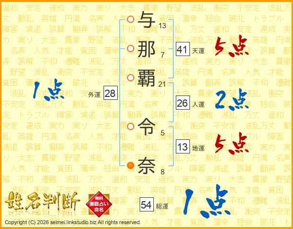 与(13画)那(7画)覇(21画) 令(5画)奈(8画)