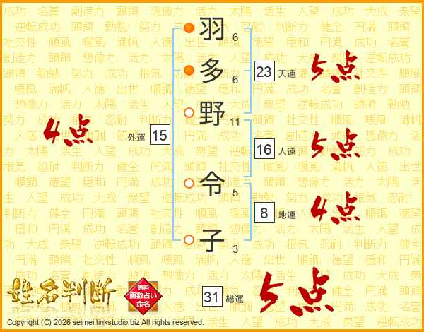 羽(6画)多(6画)野(11画) 令(5画)子(3画)