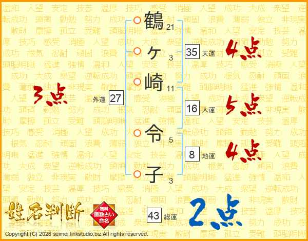 鶴(21画)ヶ(3画)崎(11画) 令(5画)子(3画)