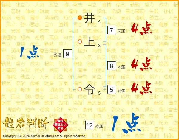 生活面を象徴する運勢です。外部から受ける影響力を表し、結婚運、家庭運や職場、環境への順応性を表します。総運から人運を引いた画数。姓や名が1文字の場合を除く。