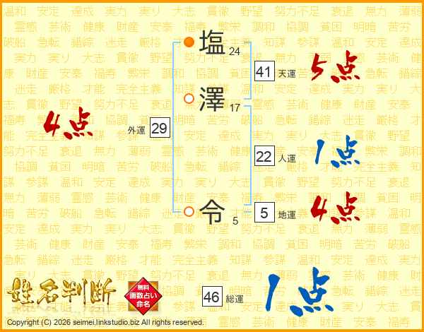 生活面を象徴する運勢です。外部から受ける影響力を表し、結婚運、家庭運や職場、環境への順応性を表します。総運から人運を引いた画数。姓や名が1文字の場合を除く。