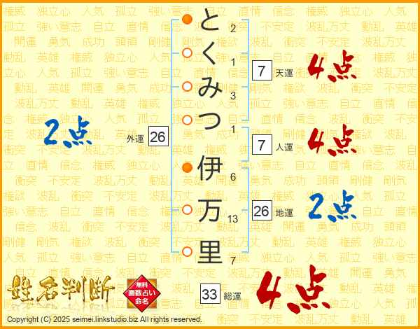 と(2画)く(1画)み(3画)つ(1画) 伊(6画)万(13画)里(7画)