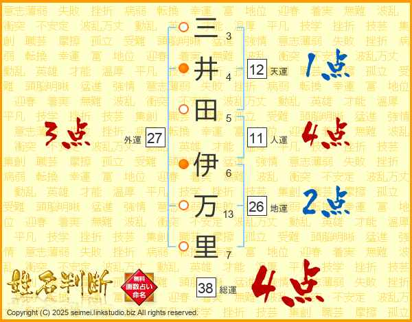 三(3画)井(4画)田(5画) 伊(6画)万(13画)里(7画)