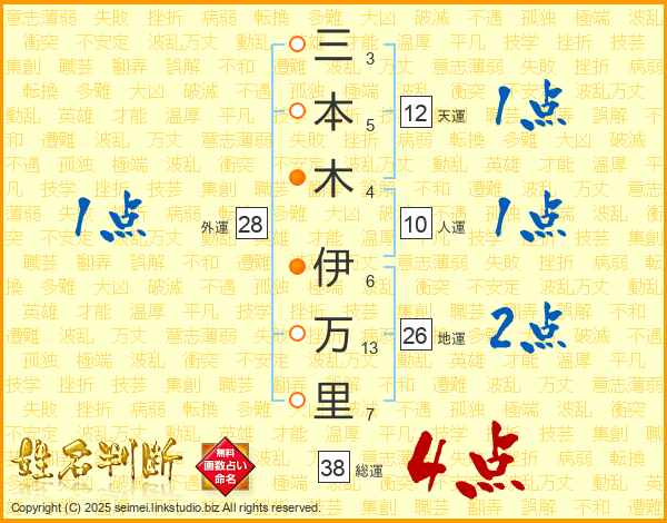 三(3画)本(5画)木(4画) 伊(6画)万(13画)里(7画)