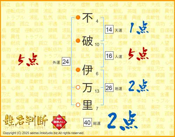 不(4画)破(10画) 伊(6画)万(13画)里(7画)