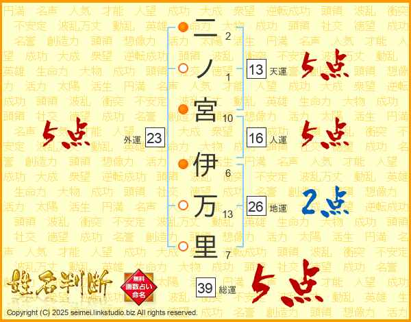 二(2画)ノ(1画)宮(10画) 伊(6画)万(13画)里(7画)