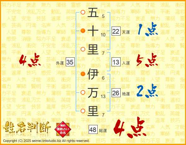 五(5画)十(10画)里(7画) 伊(6画)万(13画)里(7画)