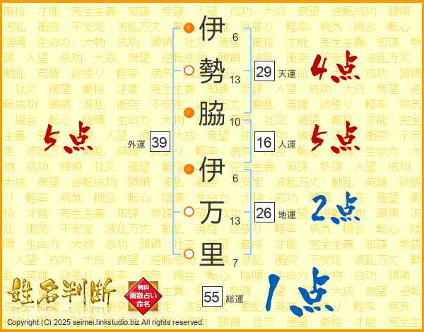 伊(6画)勢(13画)脇(10画) 伊(6画)万(13画)里(7画)