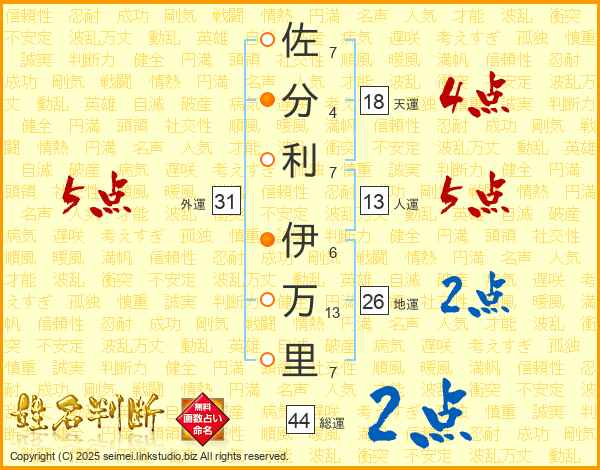 佐(7画)分(4画)利(7画) 伊(6画)万(13画)里(7画)