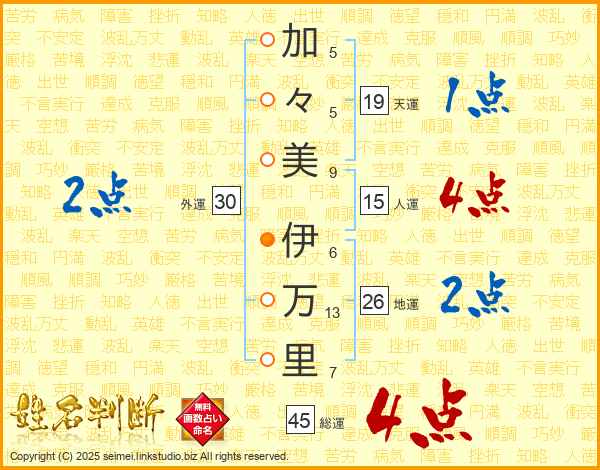 加(5画)々(5画)美(9画) 伊(6画)万(13画)里(7画)
