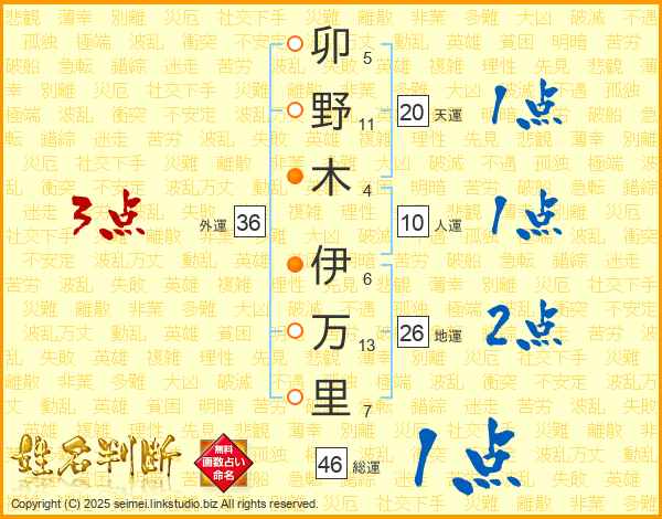 卯(5画)野(11画)木(4画) 伊(6画)万(13画)里(7画)