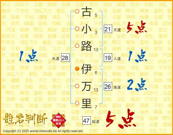 古(5画)小(3画)路(13画) 伊(6画)万(13画)里(7画)