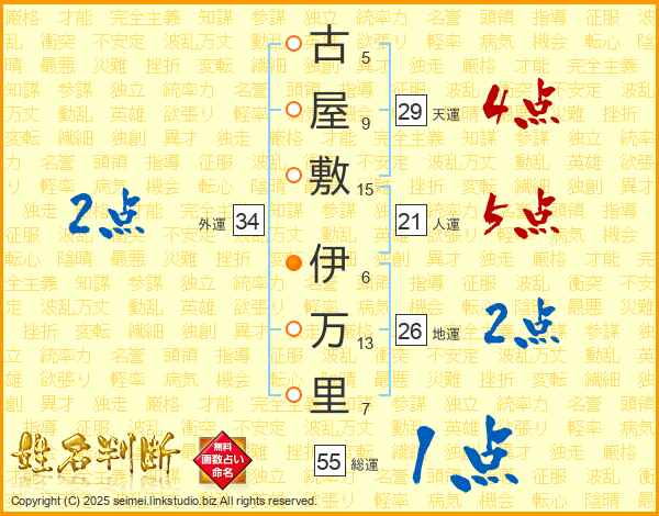 古(5画)屋(9画)敷(15画) 伊(6画)万(13画)里(7画)