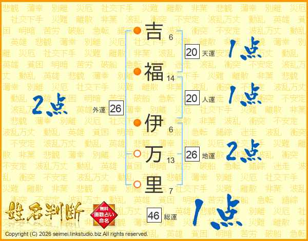 吉(6画)福(14画) 伊(6画)万(13画)里(7画)
