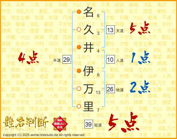 名久井伊万里さんの総運は39画の5点!